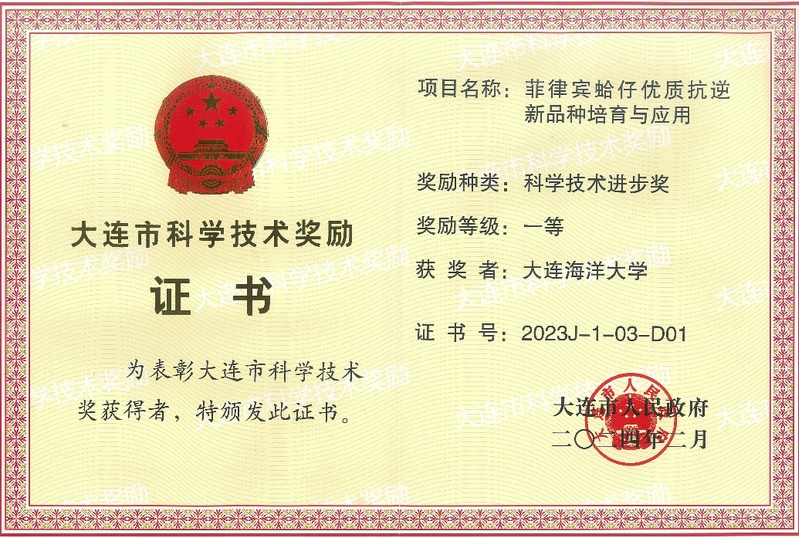 2024年11月28日,2023年度大连市科学技术奖获奖名单公布,我校“滩涂贝类良种培育与增养殖科研团队”完成的“菲律宾蛤仔优质抗逆新品种培育与应用”项目获得大连市科技进步奖一等奖。 该项目针对制约我国蛤仔养殖产业发展的瓶颈问题,系统开展了蛤仔基因组学研究,种质资源评价,良种培育及苗种本地化技术研发,培育国审蛤仔新品种3个,出版专著3部,发表学术论文300余篇,其中SCI收录120余篇,制定国家/行业/地方标准5件,授权国家发明专利30余件。使我国蛤仔遗传育种研究领跑世界。 成果在辽宁、山东、福建、天津、江苏等地实施和推广,取得显著经济、社会和生态效益。